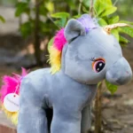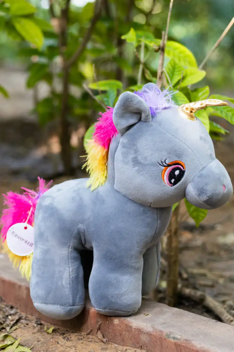 - Shiny golden horn, vibrant rainbow mane and tail.