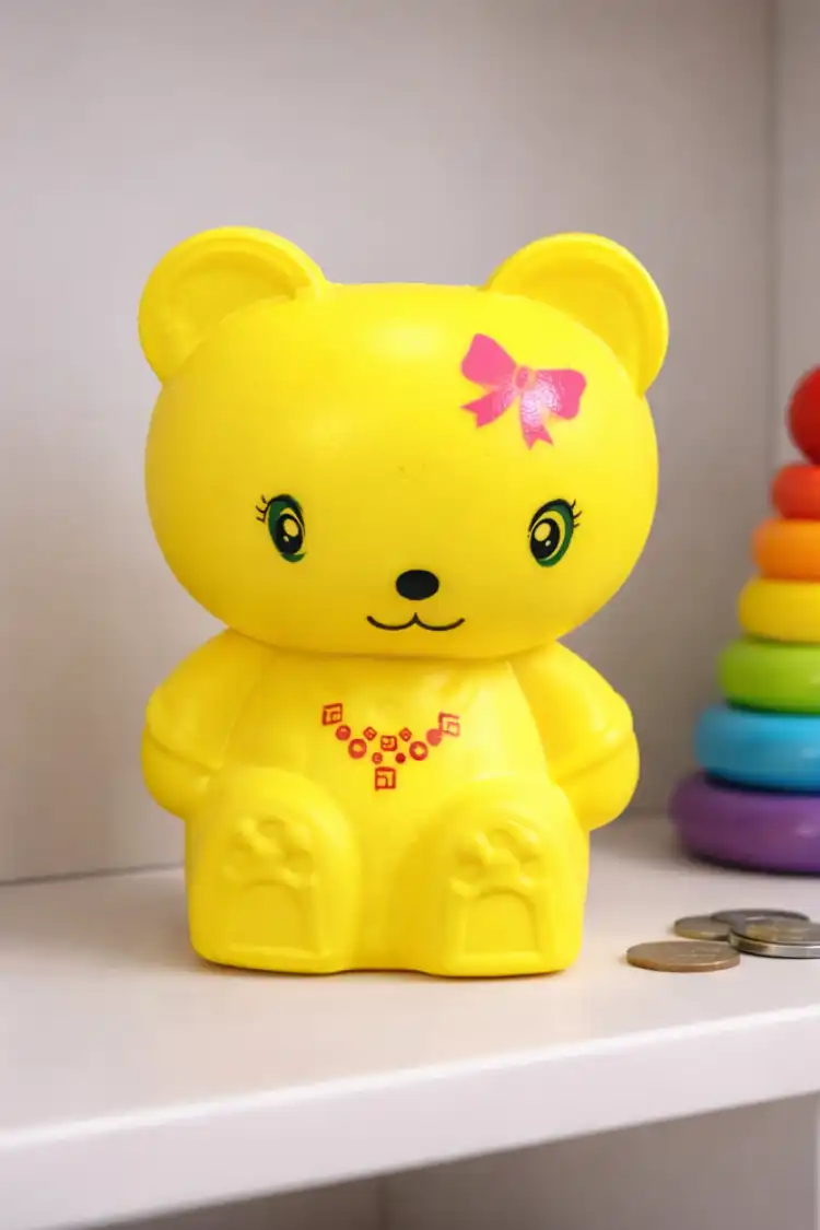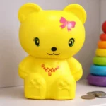 Cute yellow teddy bear coin bank with adorable design and vibrant finish. Durable, lightweight, and easy to use. Perfect for saving coins while adding a playful charm to kids’ rooms.